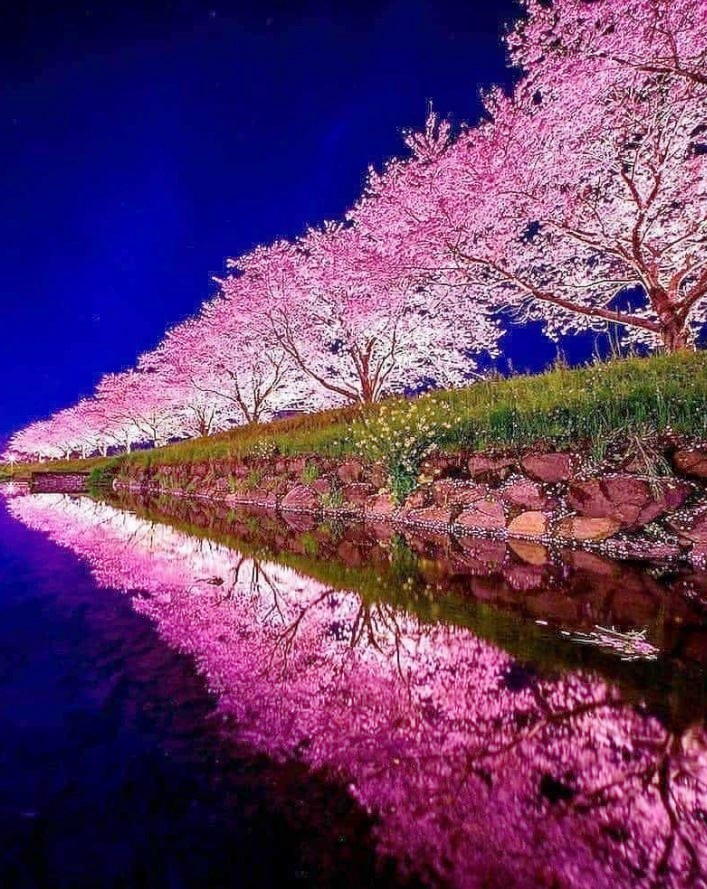 Тысячелетние секвойи, террасы рисовых чеков, цветущие поля рапса и плантации лаванды. Сакура отражающаяся в темной воде канала.